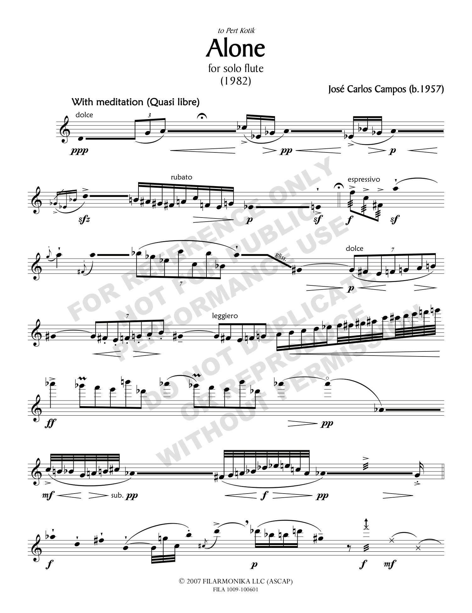 Alone is the first work for solo instrument by composer José-Carlos Campos (b. 1957), written in 1982 while still studying at the National Conservatory of Music in Lima. With a declamatory style and a meditative atmosphere, the work is a result of motifs in continual transformation, portraying the transition of different characters in constant interaction, themes which the composer later resumes in his “Capriccio” for solo clarinet (1993).