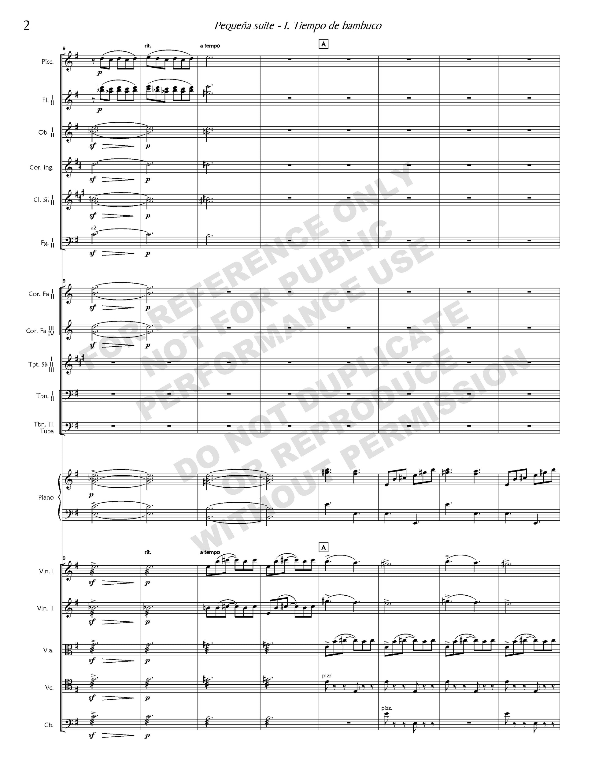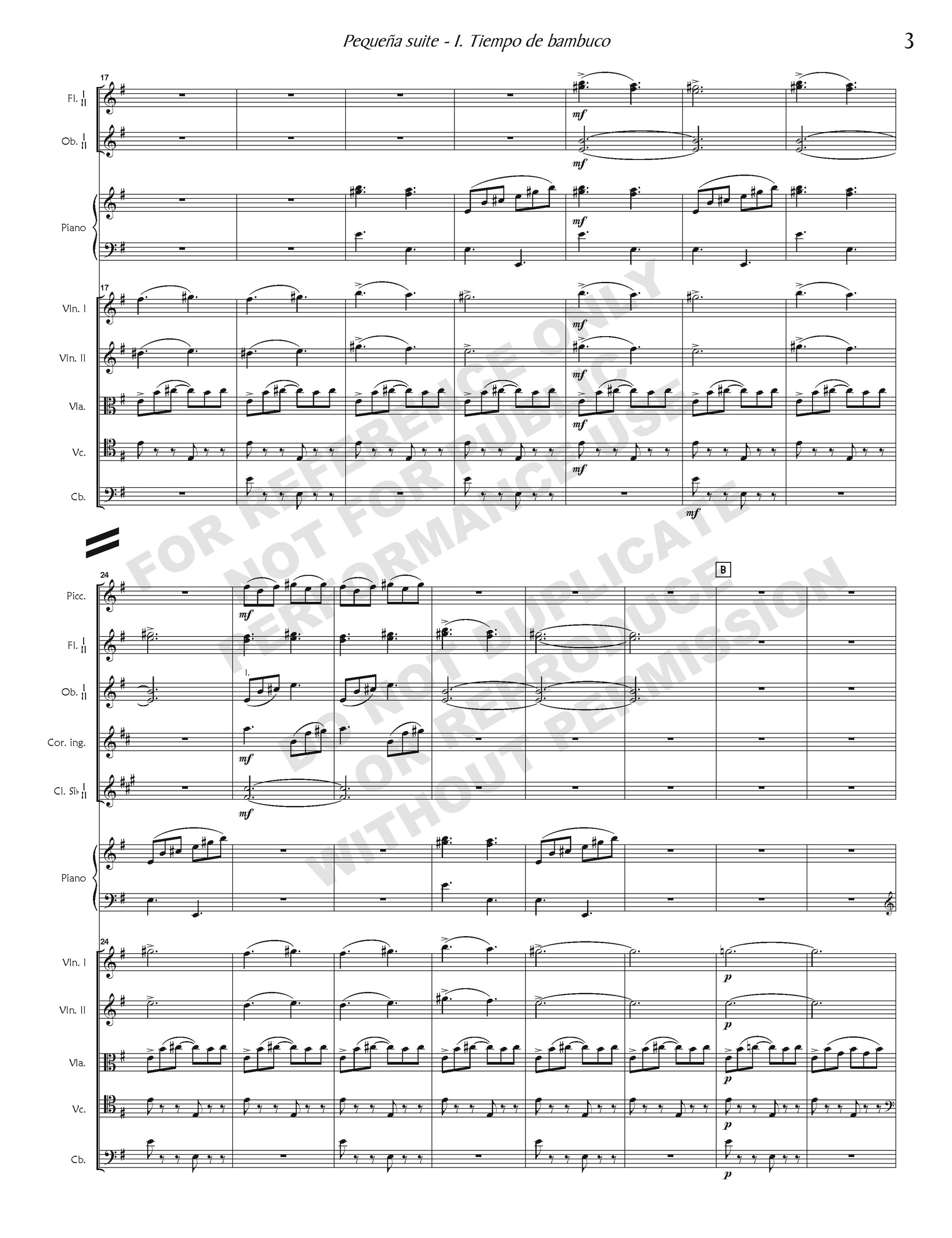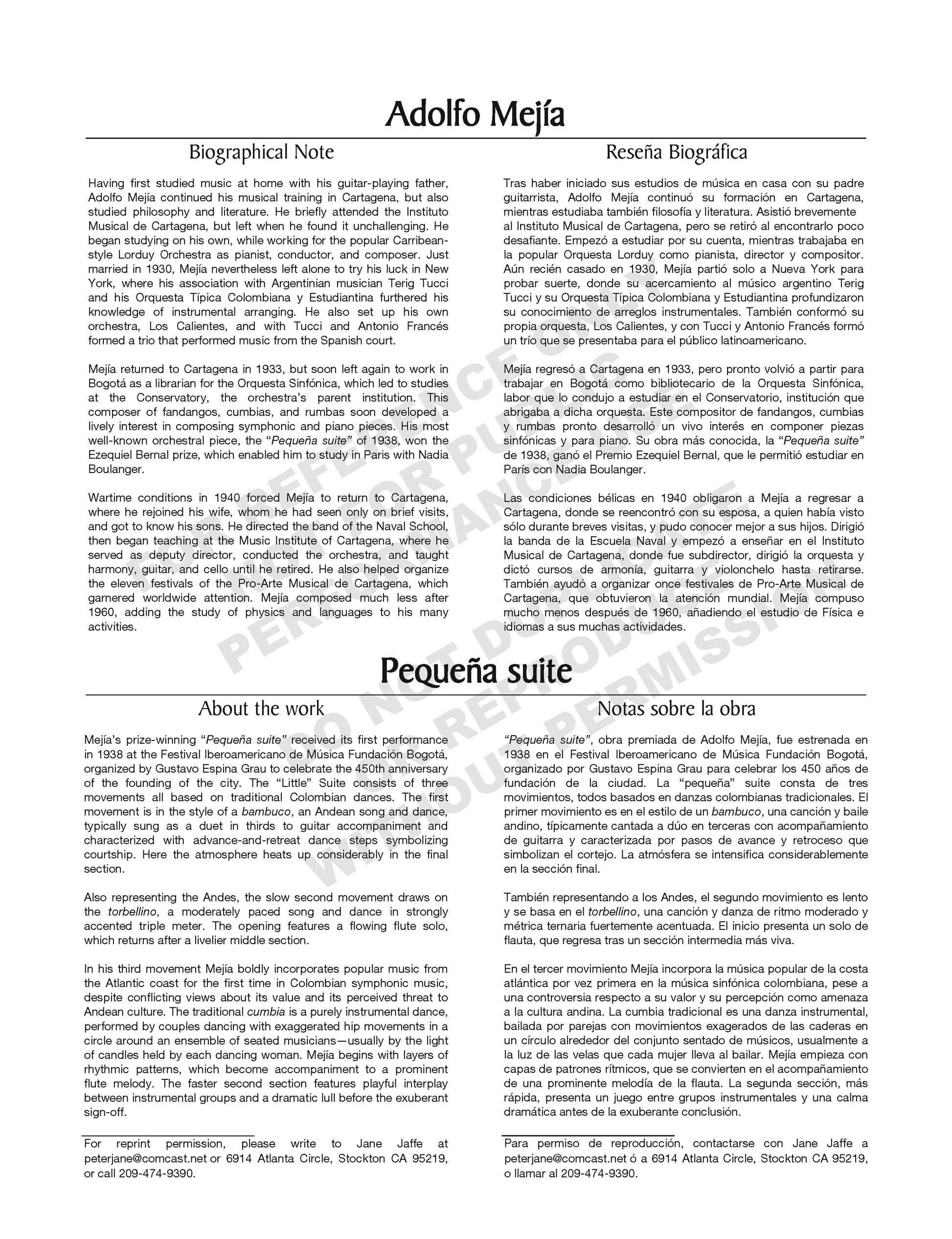 Mejía’s prize-winning Pequeña suite received its first performance in 1938 at the Festival Iberoamericano de Música Fundación Bogotá, organized by Gustavo Espina Grau to celebrate the 450th anniversary of the founding of the city. The “Little” Suite consists of three movements all based on traditional Colombian dances. The first movement is in the style of a bambuco, an Andean song and dance, typically sung as a duet in thirds to guitar accompaniment and characterized with advance-and-retreat dance steps symbolizing courtship. Here the atmosphere heats up considerably in the final section.