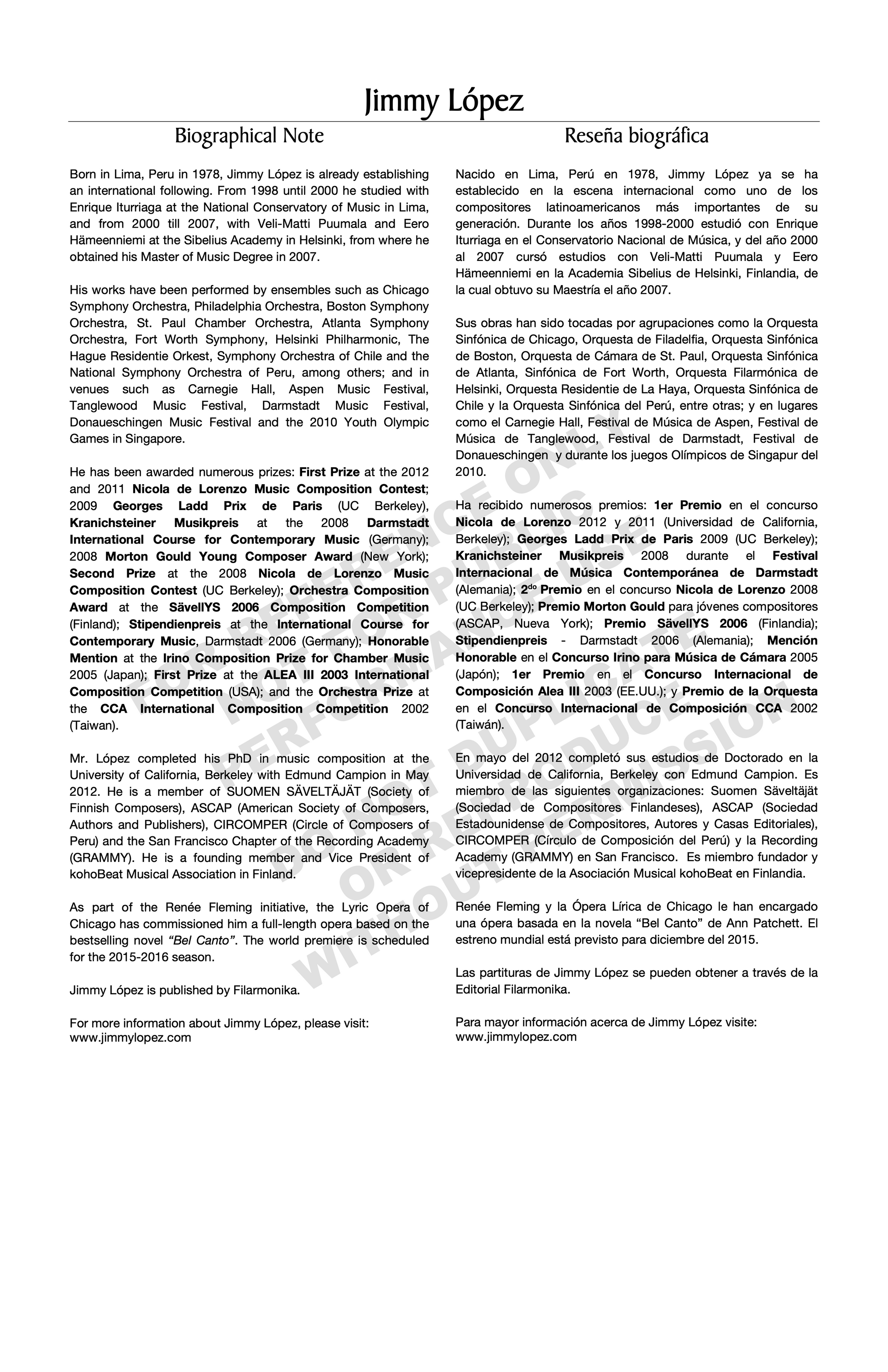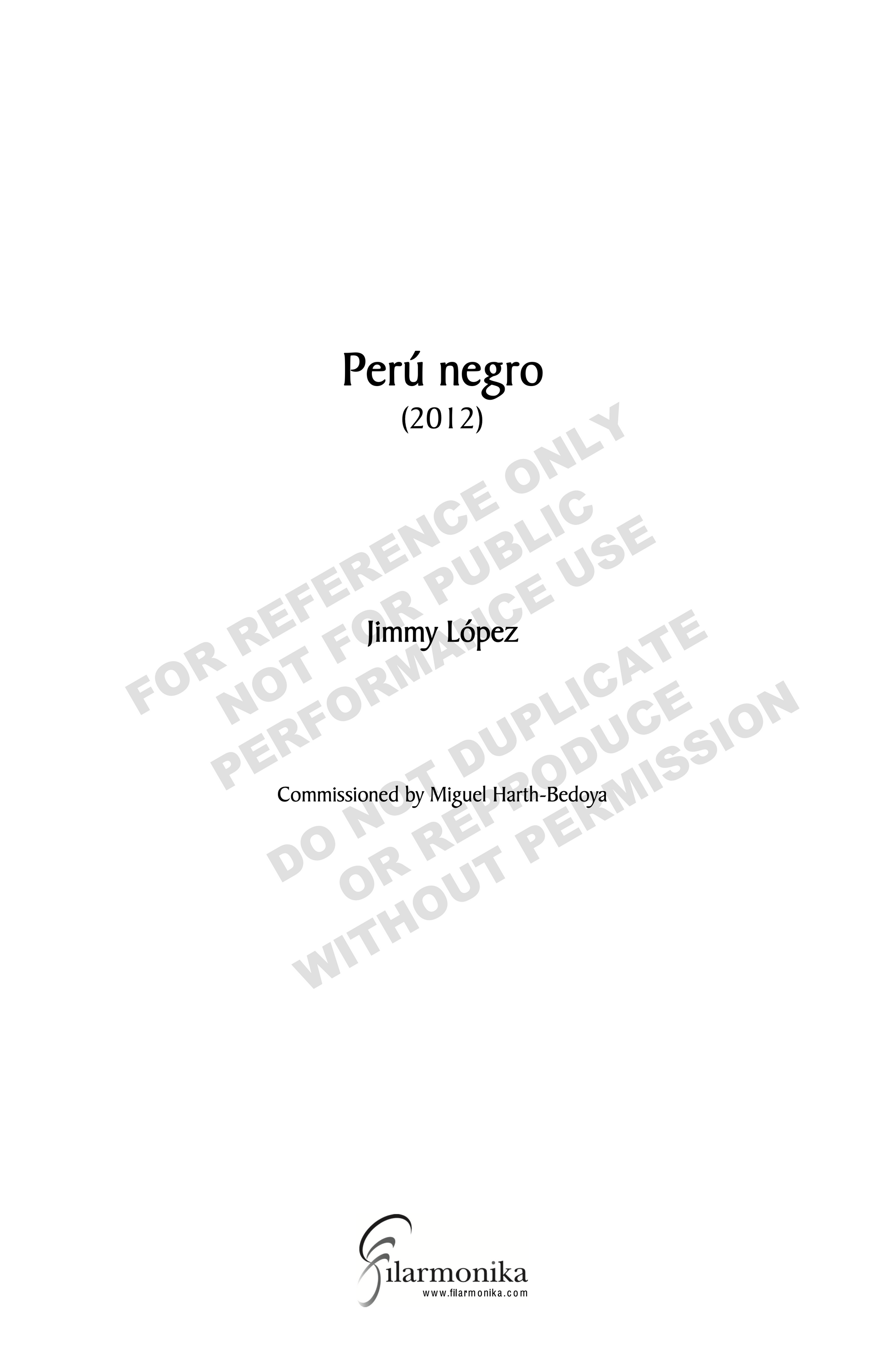 The main source of inspiration for this work is Afro-Peruvian music, but although the piece makes reference to six specific traditional songs, it is indeed very personal. I did not attempt to merely copy or reproduce Peruvian folklore. On the contrary, I assimilated it and created something entirely new and personal -an invented folklore of sorts, which bears the seal of my musical language.