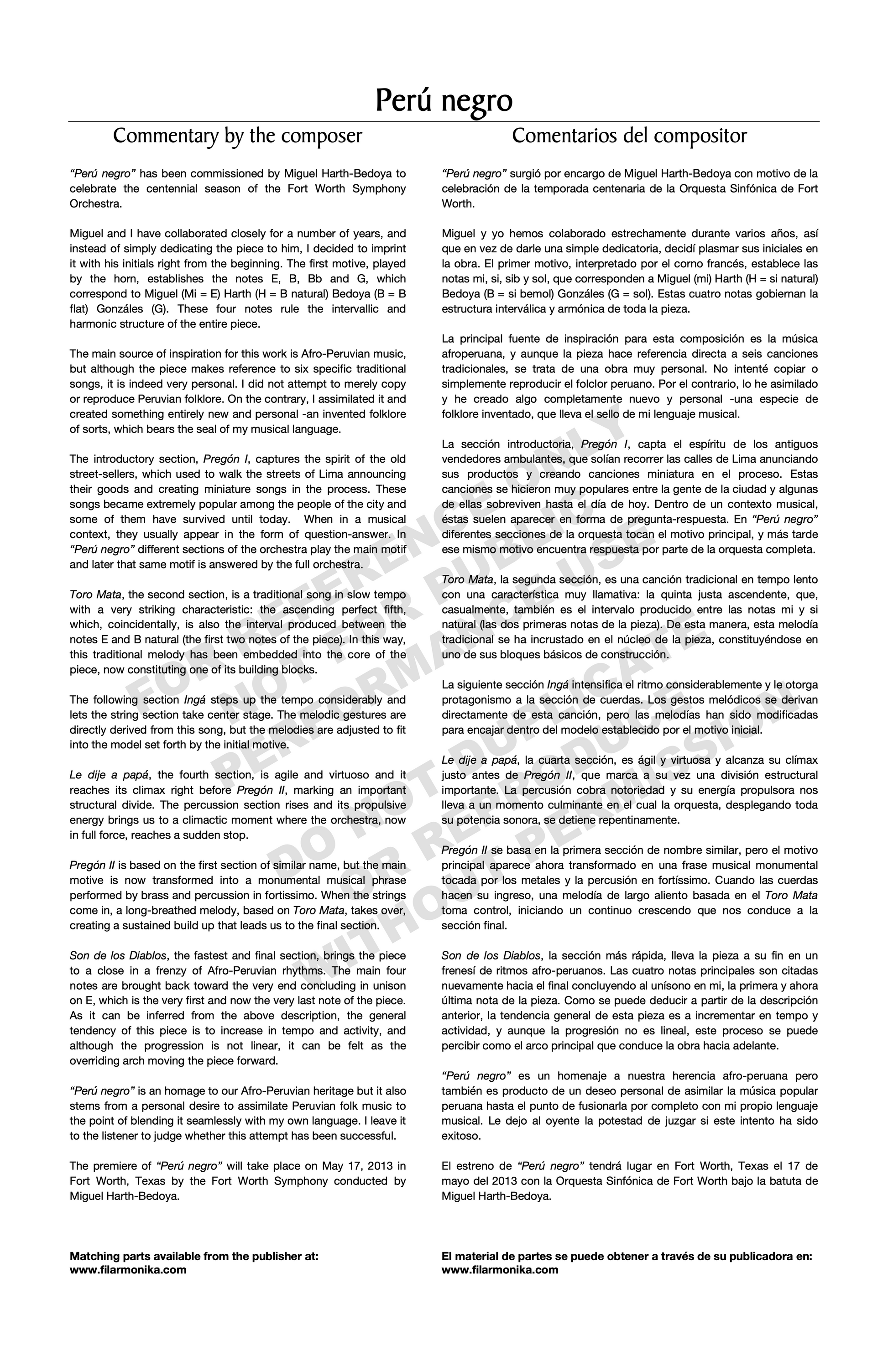Perú negro was commissioned by Miguel Harth-Bedoya to celebrate the centennial season of the Fort Worth Symphony Orchestra.
