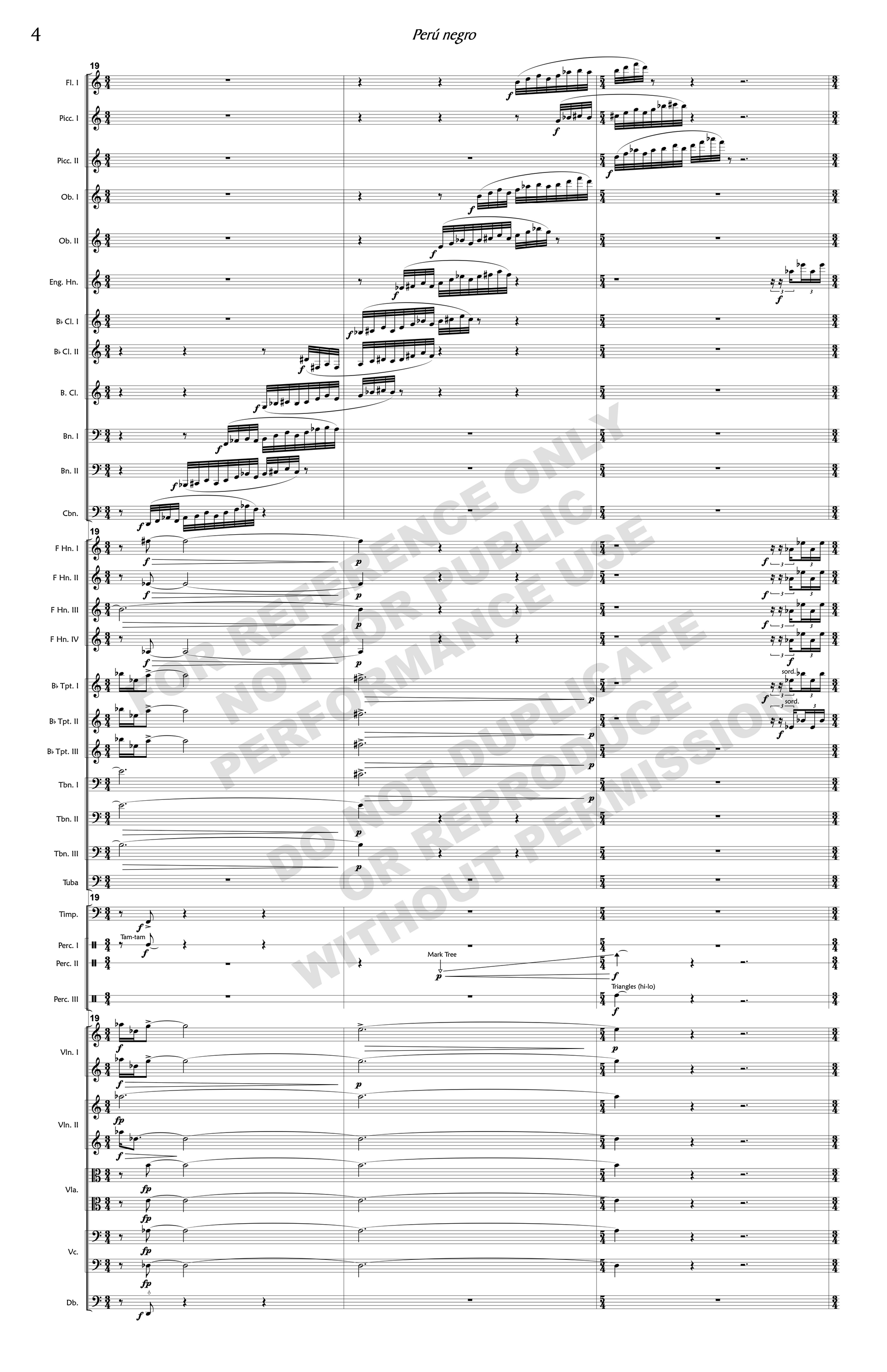 “Son de los Diablos”, the fastest and final section, brings the piece to a close in a frenzy of Afro-Peruvian rhythms. The main four notes are brought back toward the very end concluding in unison on E, which is the very first and now the very last note of the piece. As it can be inferred from the above description, the general tendency of this piece is to increase in tempo and activity, and although the progression is not linear, it can be felt as an overriding arch moving the piece forward.